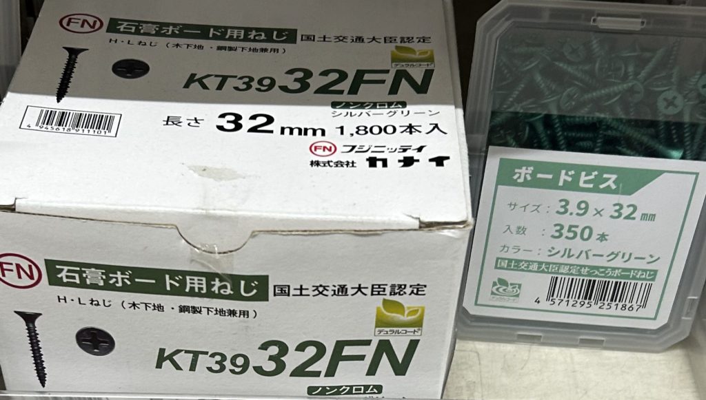 DIYであれば長さは32㎜のビスで天井の9㎜ボードも壁の12㎜ボードも併用してもOKです(天井は下地からの貫通には注意)